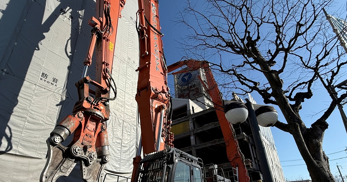 灰色の防音シートに包まれた建物の前で、重機がゆっくりと腕を伸ばしています。鉄をつかむ鈍い音が、乾いた冬の空気に溶けていきます。