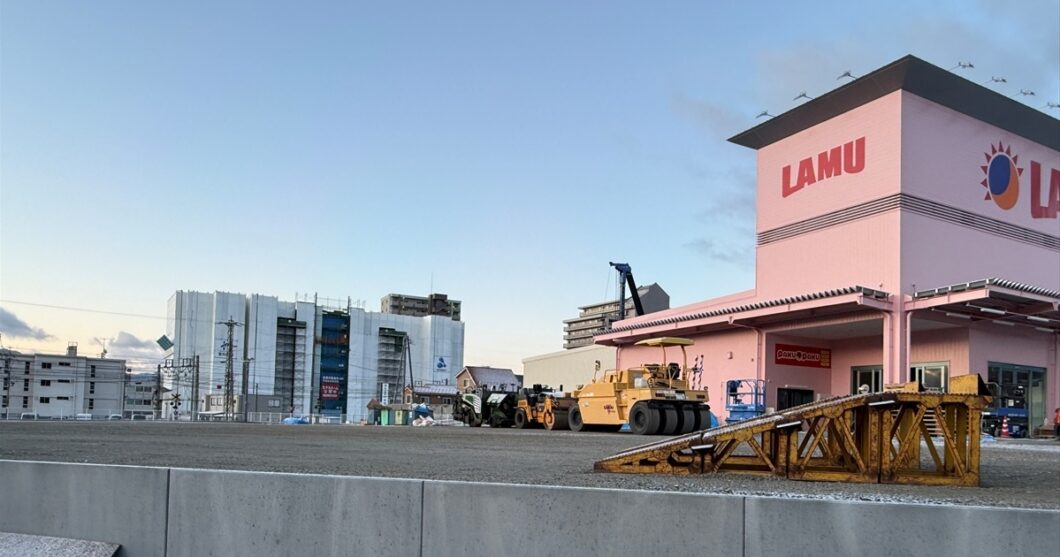 ディスカウントスーパーマーケット「ラ・ムー」は六月の開店に向けて建築が進み、